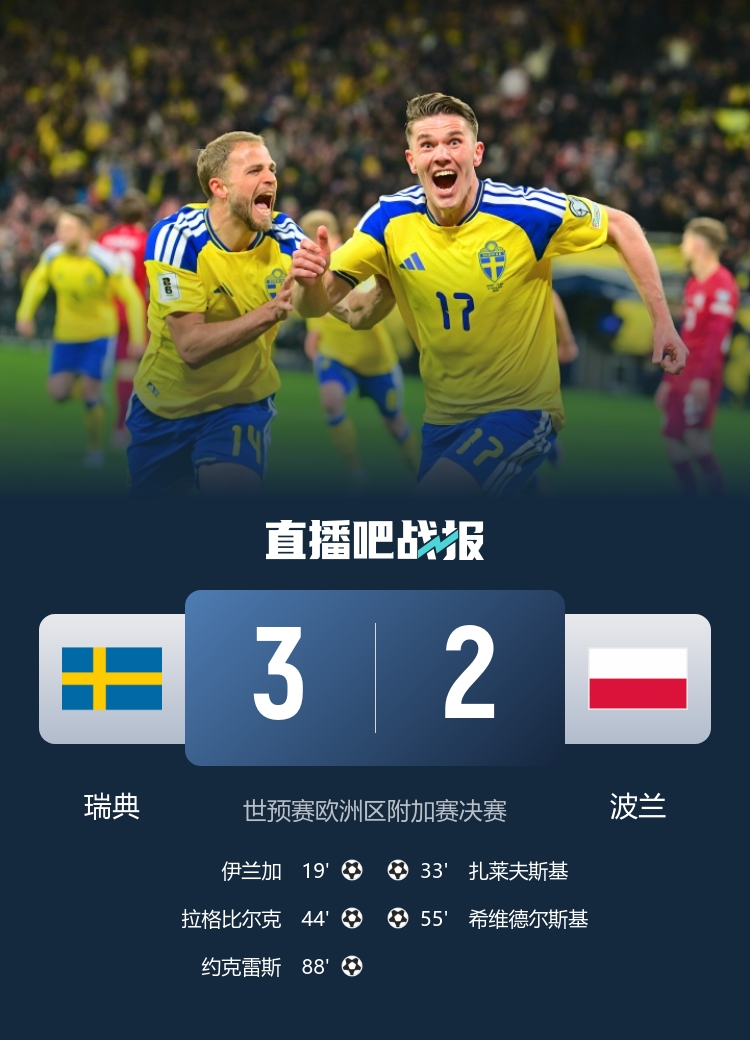 晋级世界杯!瑞典3-2波兰 约克雷斯88分钟绝杀制胜伊兰加建功