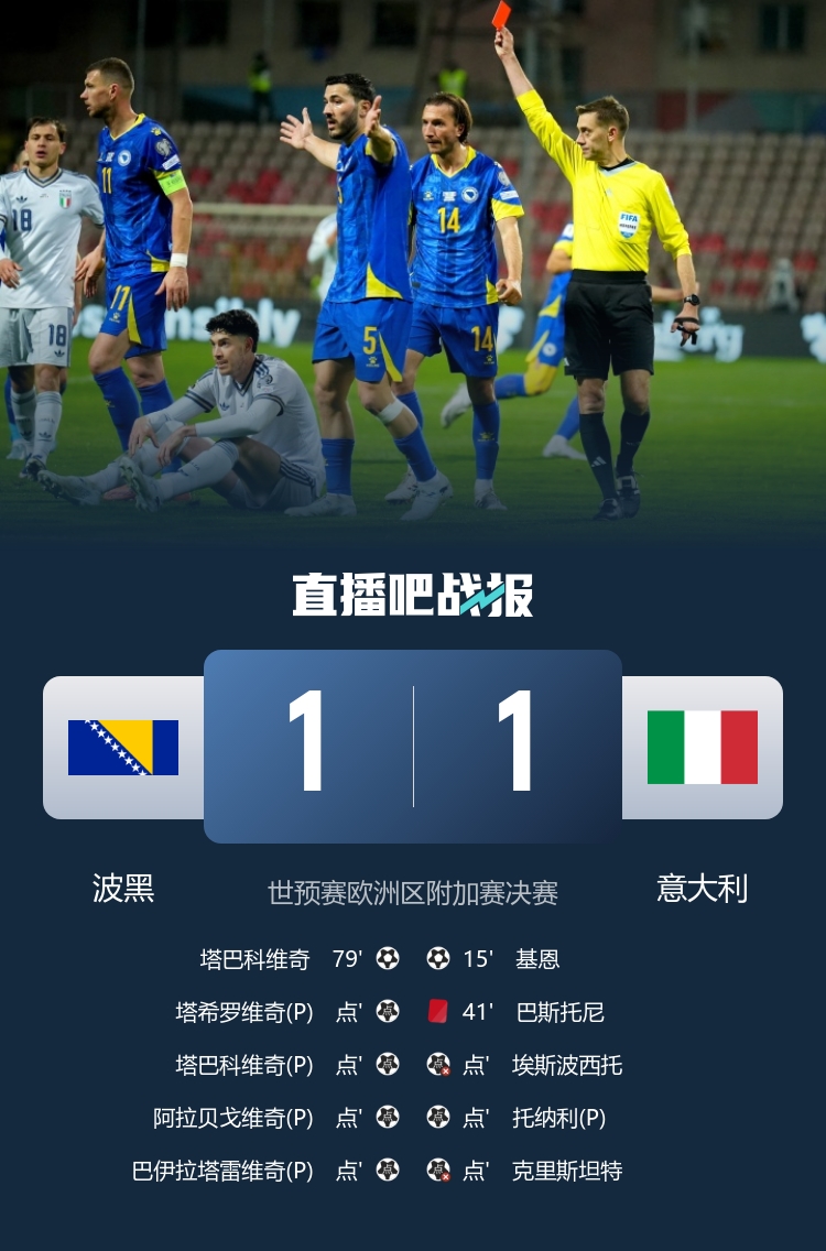 世欧预附加赛决赛,意大利不敌波黑,再次无缘晋级2026美加墨世界杯。同时,波黑时隔两届重回世界杯,自2014年后再次登上世界杯舞台。